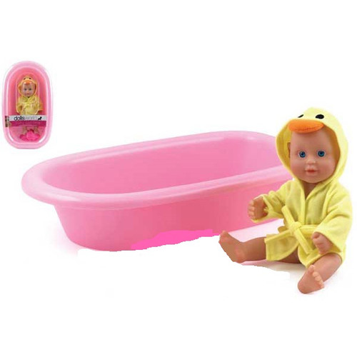 A 25cm doll that comes with a bath , dressed in a cute ducky robe.